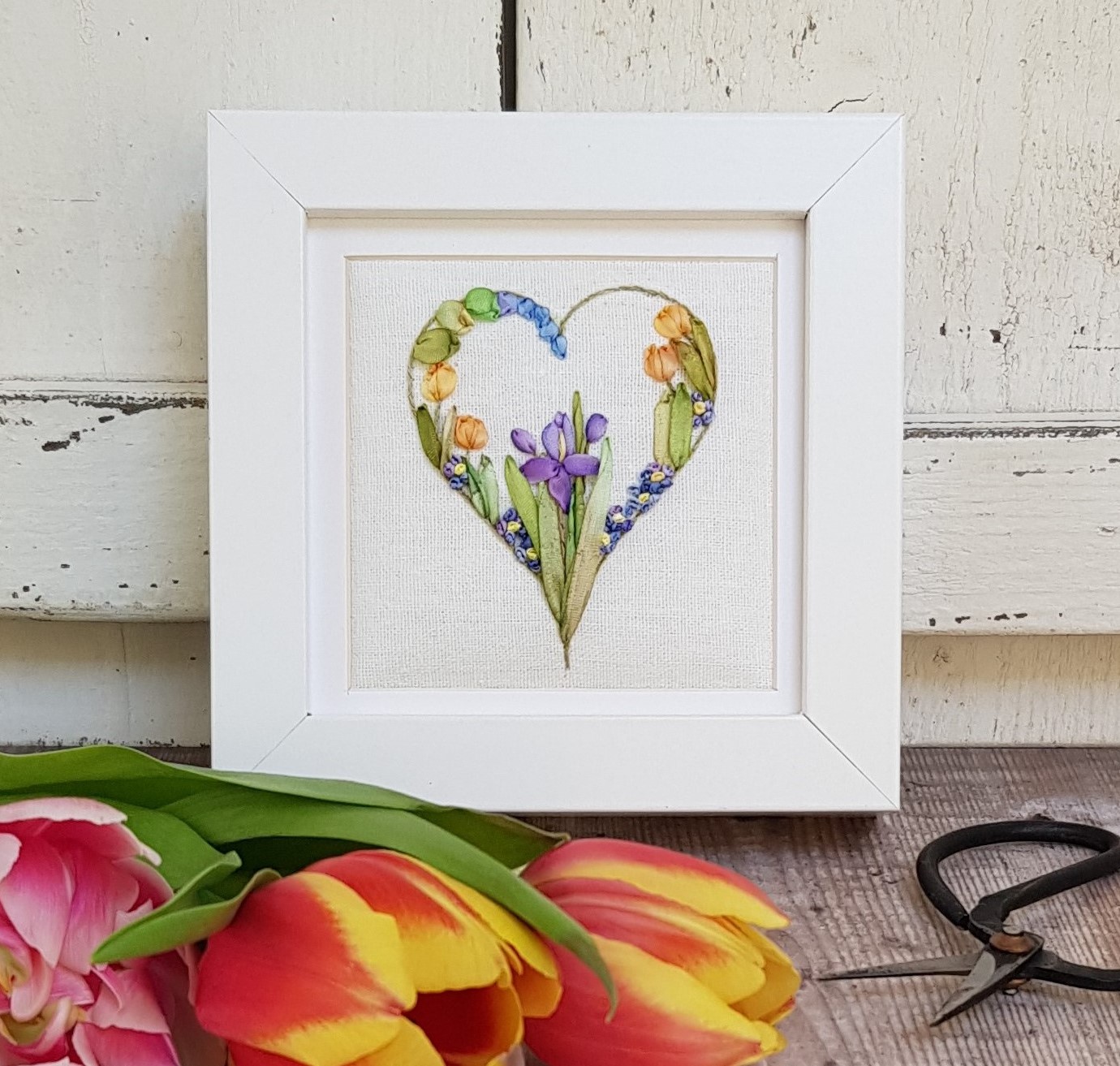 Inside, you will find a selection of silk ribbons in delicate shades of violet, yellow and green. The kit also includes the design screen printed onto the fabric, needles and an easy-to-follow instruction guide; all wrapped up in a bespoke designed folder.