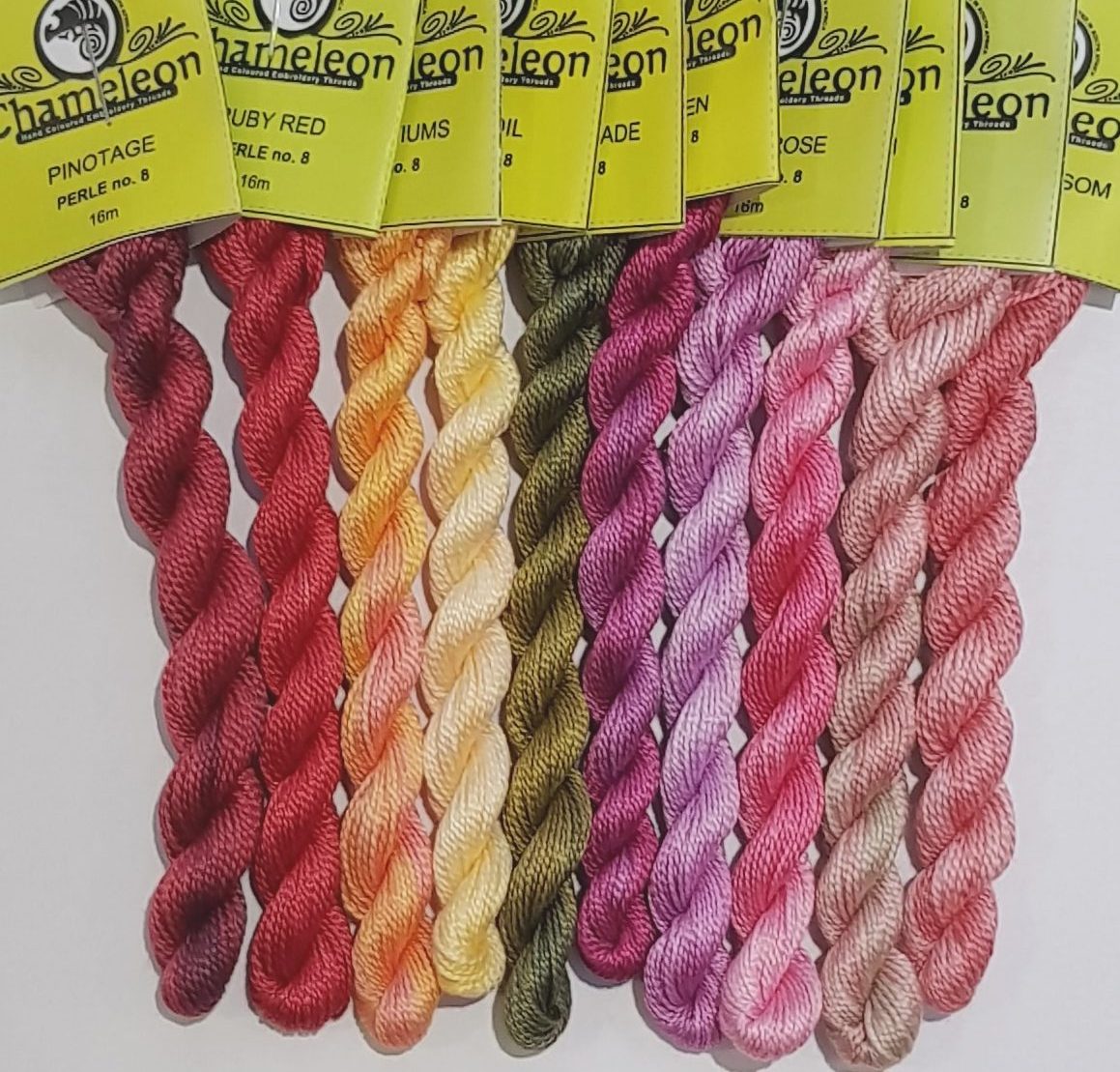 10 skeins of Perle #8 Cotton hand-dyed by Chameleon Threads. DMC unbleached perlè no.8 cotton is used as the base thread. Perlè cotton is a hard wearing twisted thread with a beautiful sheen and cannot be separated. It can be used for canvas work, counted thread embroidery, crewel work and free style embroidery. There are 16m on each skein of thread.